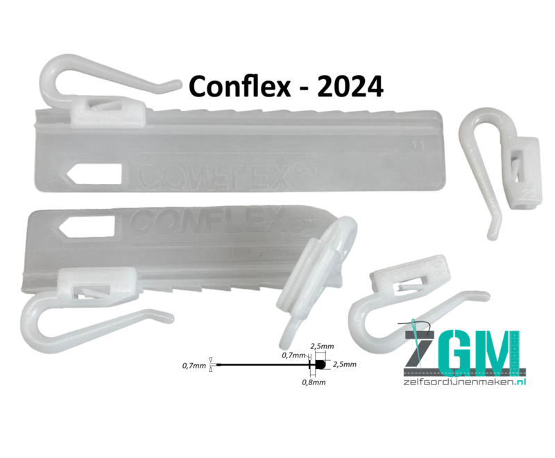 Deze specifieke uitvoering van de Conflex haak wordt niet meer geproduceerd. We verkopen onze laatste voorraad uit aan klanten die hun bestaande gordijnen willen onderhouden. Voor dit artikel geldt dan ook: Op = Op!